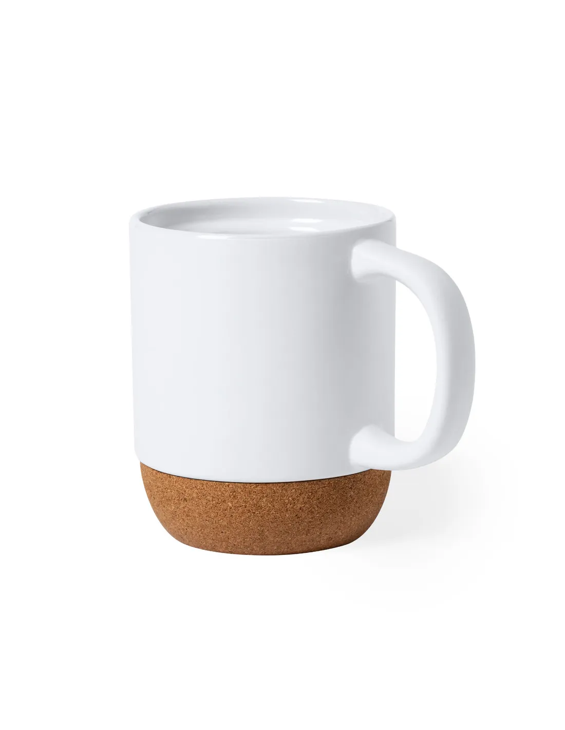 Taza blanca de cerámica, acabado mate, con base de corcho natural.