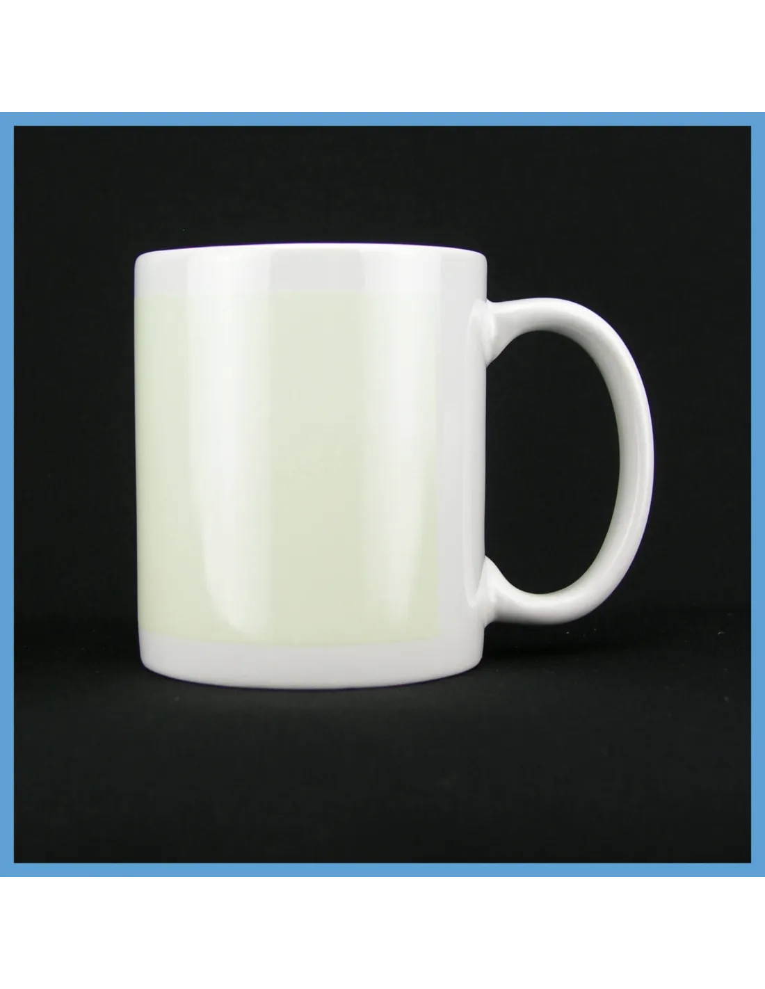 Taza blanca de cerámica con recuadro foto luminiscente. La zona foto luminiscente brillará en la oscuridad y ésto hará que la zona impresa sea visible.